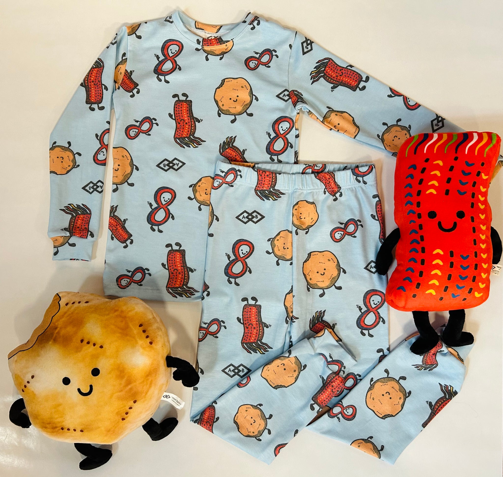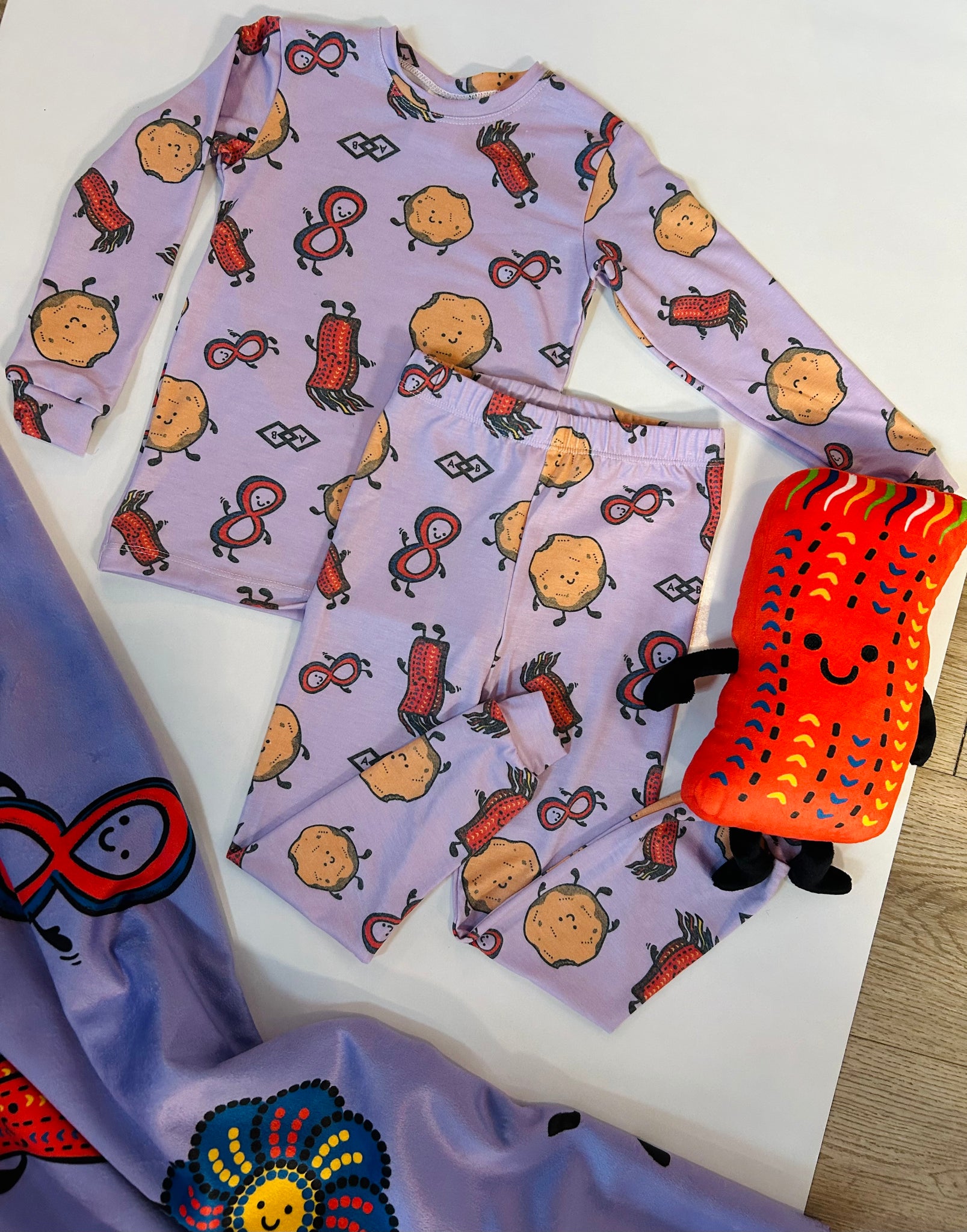 NEW product alert! Now that our well loved Métis trio has been bringing joy to homes for a few years, it was time to turn them into cozy lounge sets. Feat Banny (bannock), Sasha (Métis Sash) and Finn (Infinity symbol) on buttery soft fabrics that are breathable + soft to the touch. Using a blend of bamboo + poly fabrics. Made in Canada. A 2 piece long sleeve set that is intended to wrap up your little ones with Métis pride.