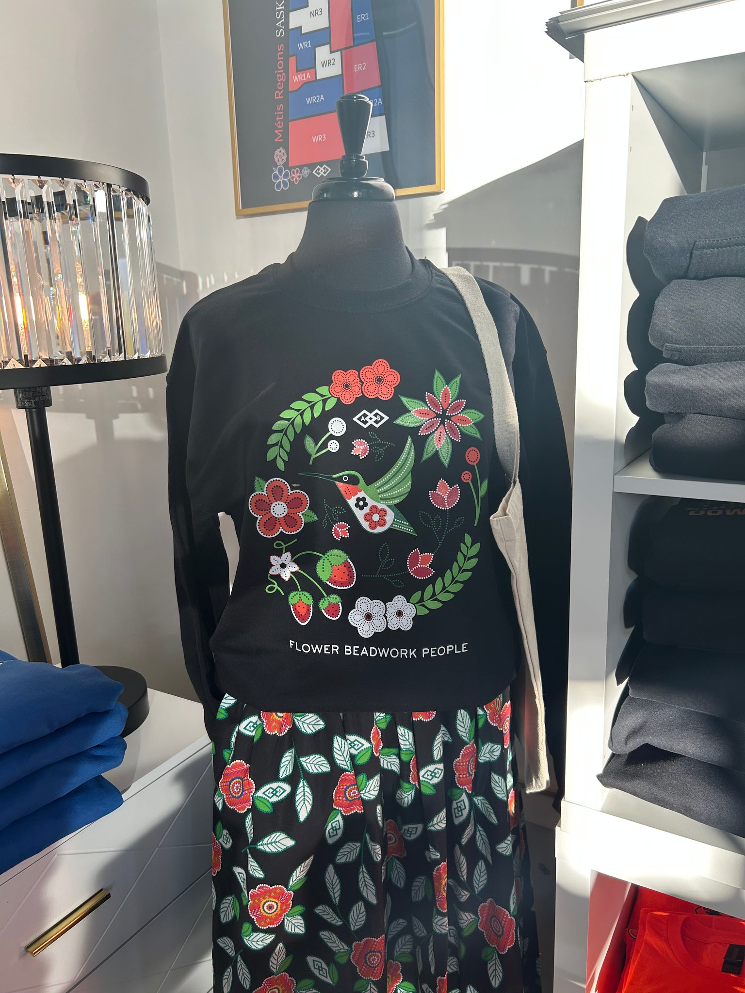 The Flower Beadwork People design. Inspired by being on the Batoche Homelands for Back to Batoche + seeing people adorned with beaded pins, jewellery, vests, skirts, etc. Fun fact: The Métis are known as the Flower Beadwork People. Design applied by screen print. These are UNISEX adult tees. Oversized fit. See attached sizing charts. Ally friendly!
